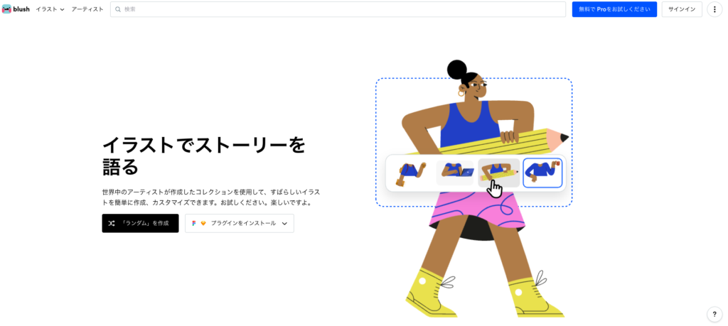 Blushは、複数のクリエイターが作成したイラスト素材を一つのプラットフォームで提供している革新的なサービスです。Figmaプラグインとしても利用でき、デザインツール内で直接素材を検索・挿入できる点が特徴です。